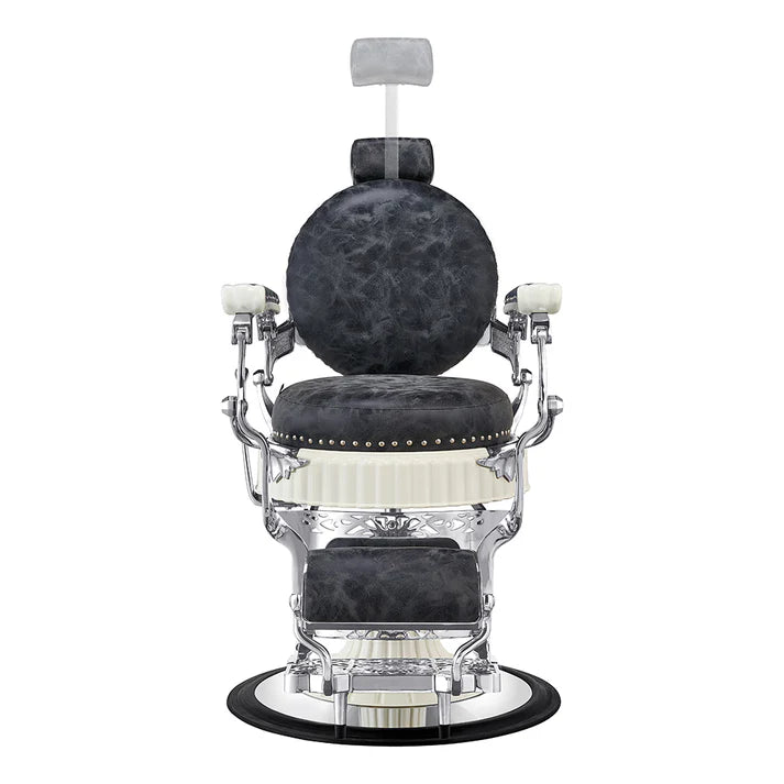 Introducing the DIR Mikado Vintage Barber Chair: The perfect blend of European modern design and classic barbershop tradition. Features a sturdy, antique-detailed chrome frame, luxurious faux leather, and a reclining back with a padded flip-up footrest—the ultimate comfort and style upgrade for your business.