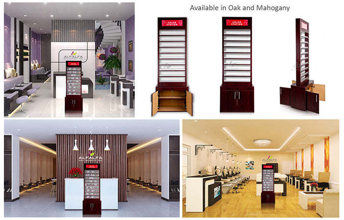 This impressive Wooden Polish Stand Rack is an attractive and space-saving way to store your salon's nail polish collection. This custom-made wooden polish stand is hand crafted of your choice of New natural Oak or Mahogany laminate. Each shelf holds two rows of bottles and features see-through metal racks that allow customers to easily view labels and colors at a glance. (Nail polish not included). The Wooden Polish Stand holds up to 288 polish bottles and holds most brands, including CND and OPI. Additionally, the base of the stand features a convenient cabinet for extra storage. For quality assurance, each rack is designed and assembled here in the USA.